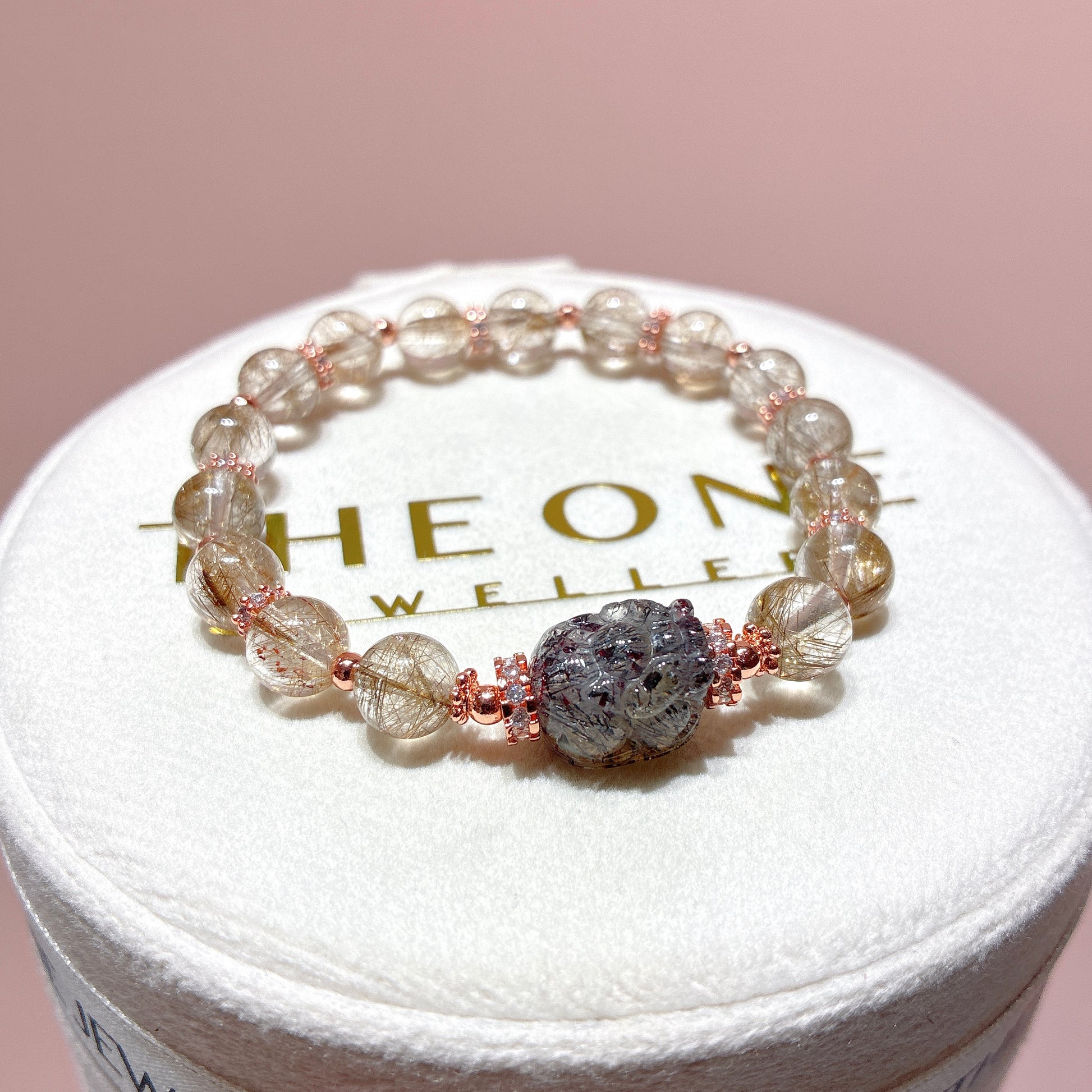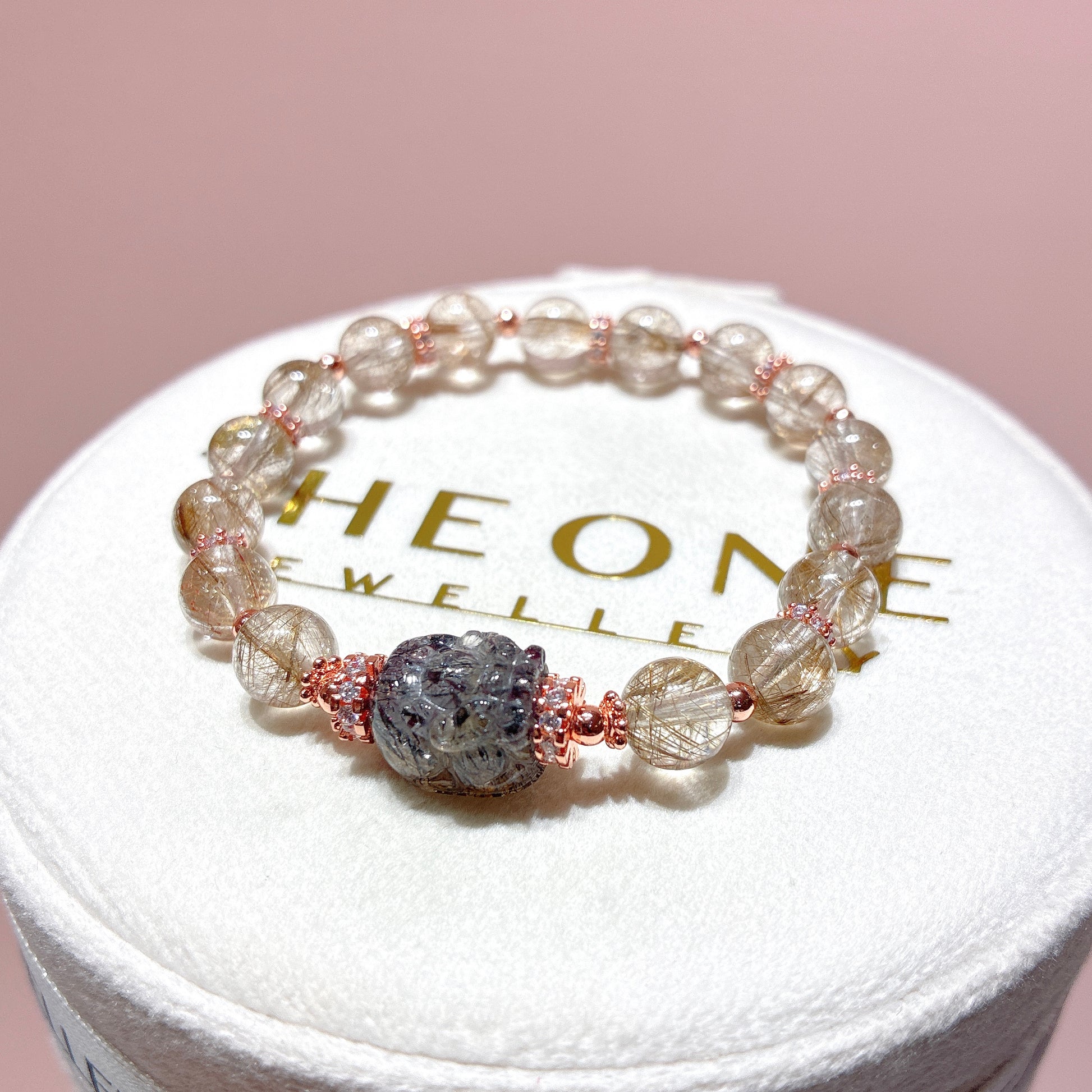 內含銀白色的金紅石髮絲,髮絲多細柔綿密,產量極稀少。